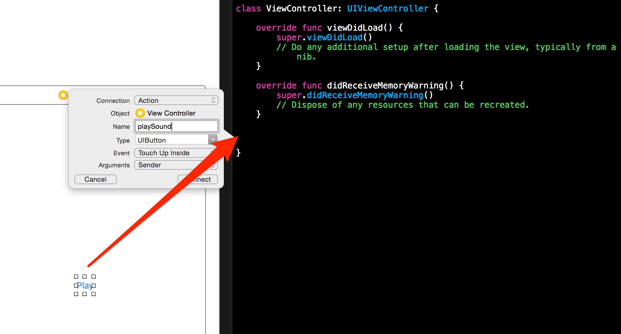 Next we’ll need to add an action so that we can execute some code when the button is pressed. Just Control-drag from the button to ViewController.swift, set the connection to Action and give it a name (ie: playButton)