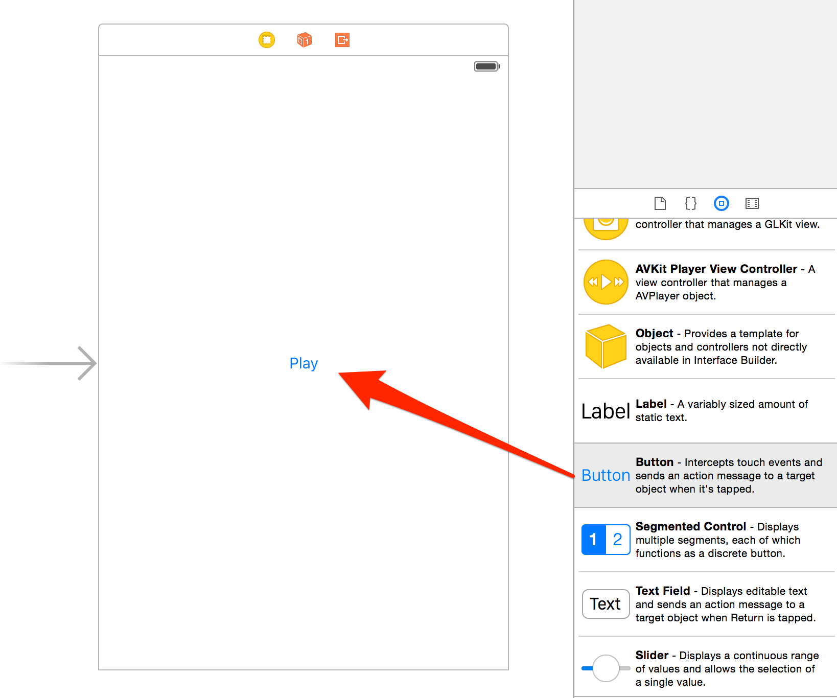 If we’re going to play audio, we’ll need a button to start playback. Open up Main.storyboard in the Interface Builder, and drag a Button from the Object Library on to the storyboard: